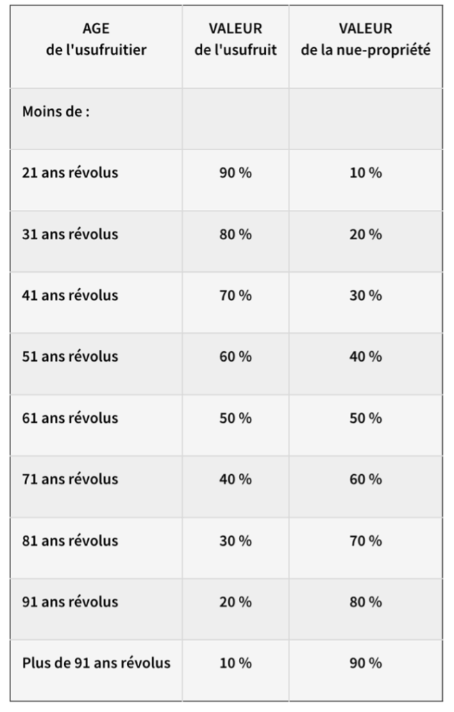 En matière de transmission à titre gratuit (donation ou succession), la valeur du bien démembré est répartie entre usufruit et nue-propriété selon un barème fiscal fixé par l’article 669 du CGI. Ce barème, fonction de l’âge de l’usufruitier, détermine la fraction de la valeur globale attribuée à l’usufruit et à la nue-propriété au jour de l’opération. Plus l’usufruitier est âgé, plus la valeur fiscale de l’usufruit est faible et celle de la nue-propriété corrélativement élevée.