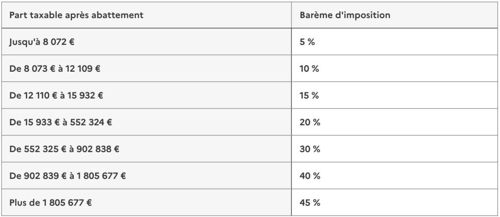Après déduction de l’abattement, la base imposable est taxée selon un barème progressif. En ligne directe (enfants, parents, petits-enfants), le barème est le suivant :