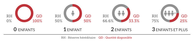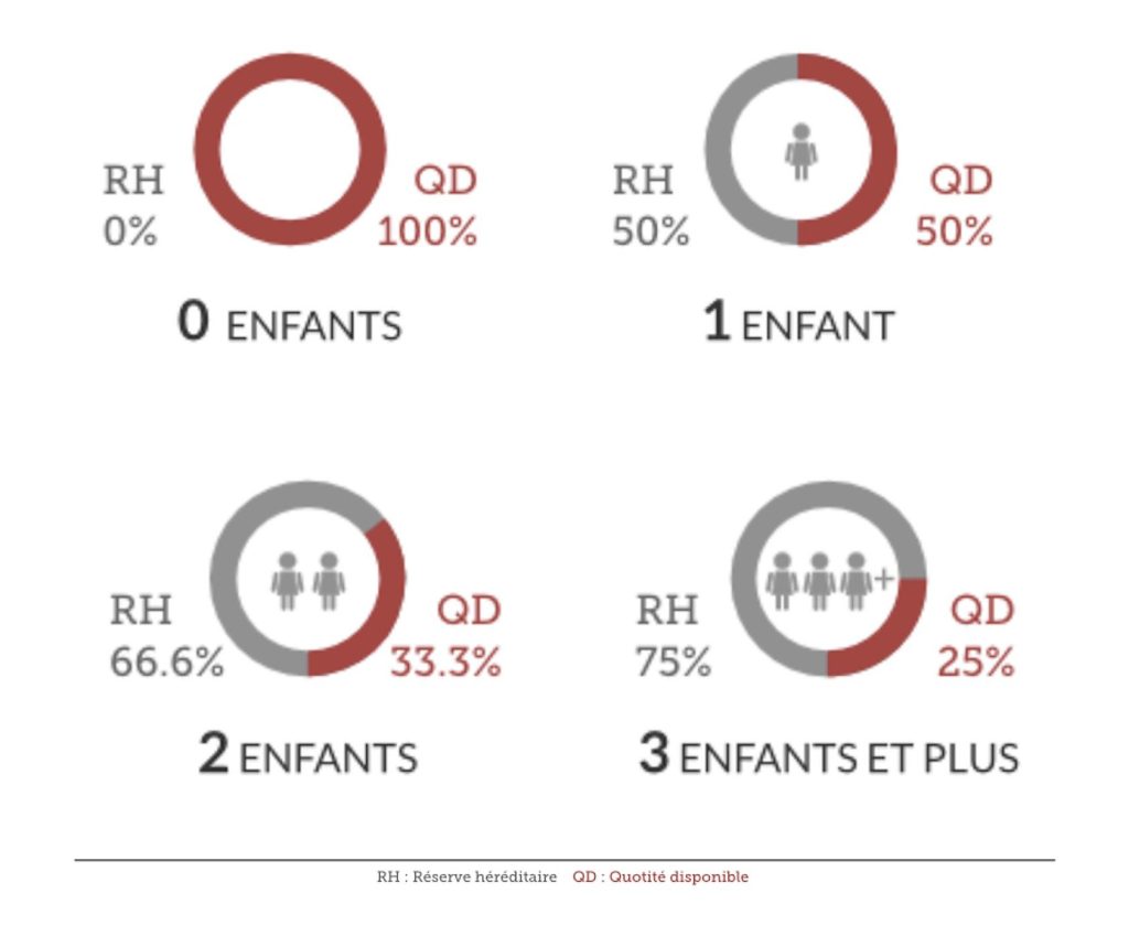 La fraction de réserve dépend du nombre d’enfants : elle équivaut à la moitié des biens du défunt s’il ne laisse qu’un seul enfant, les 2/3 des biens s’il laisse deux enfants, et les 3/4 s’il laisse trois enfants ou plus. Le patrimoine restant au-delà de cette réserve constitue la quotité disponible, dont le défunt peut librement disposer en faveur de toute personne de son choix (héritier ou tiers) par testament.